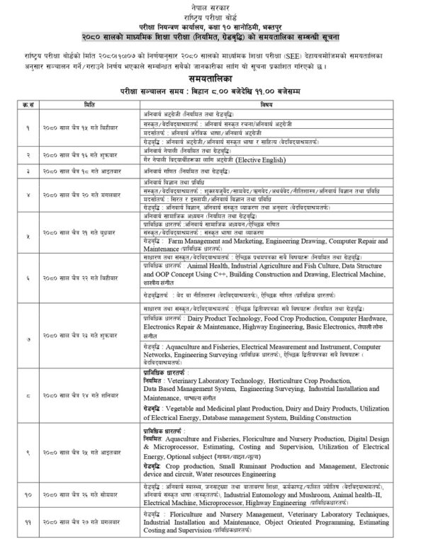राष्ट्रिय परीक्षा बोर्डअन्तर्गत परीक्षा नियन्त्रण कार्यालयको बैठकले एसईईको तालिका सार्वजनिक गरेको हो । परीक्षाका लागि चार लाख ८९ हजारभन्दा धेरै विद्यार्थीले फारम भरेका छन् ।
