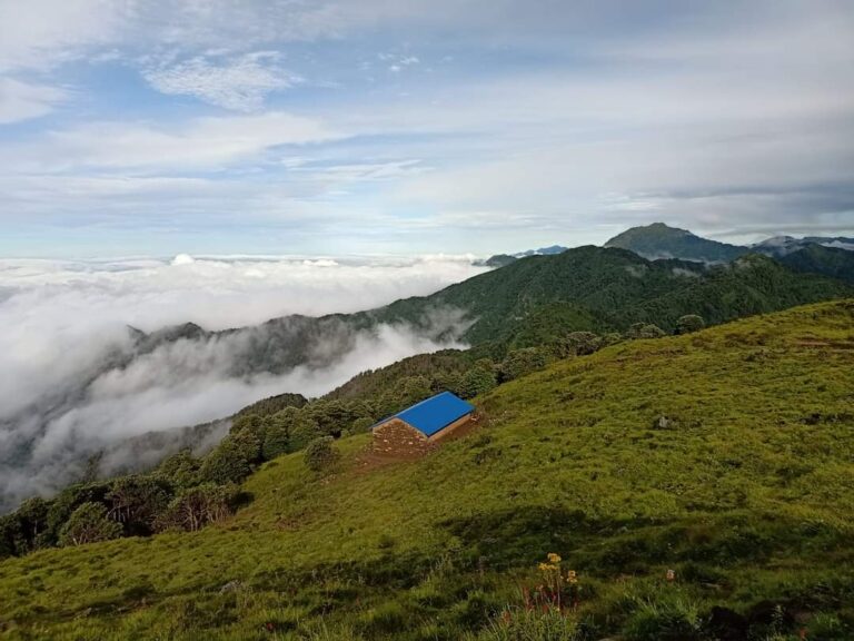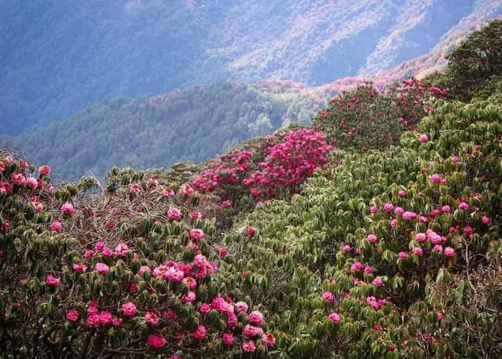 अग्लो धुरी । धुरीको फराकिलो आंगनमा फुलेका थरीथरीका फुलहरुले सजिएको घना जंगल । नाङ्गी नाङ्गो छैन ।