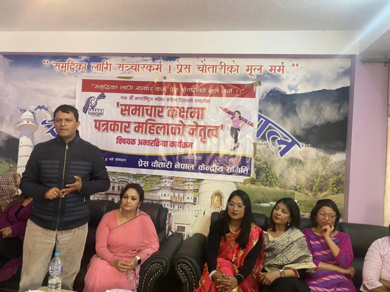 काठमाडौं । समाचार कक्षमा मात्रै होइन नीति–निर्माण तहका क्षेत्रमा पनि पत्रकार महिलाको नेतृत्व हुनुपर्ने आवाज उठेको छ । ११४ औं अन्तर्राष्ट्रिय श्रमिक महिला दिवसको सन्दर्भमा प्रेस चौतारी नेपाल केन्द्रीय कमिटीले आयोजनामा आज आयोजना गरेको समाचार कक्षमा पत्रकार महिलाको नेतृत्व विषयक अन्तरक्रिया कार्यक्रम सहभागीहरुले यस्तो आवाज उठाएका हुन् ।