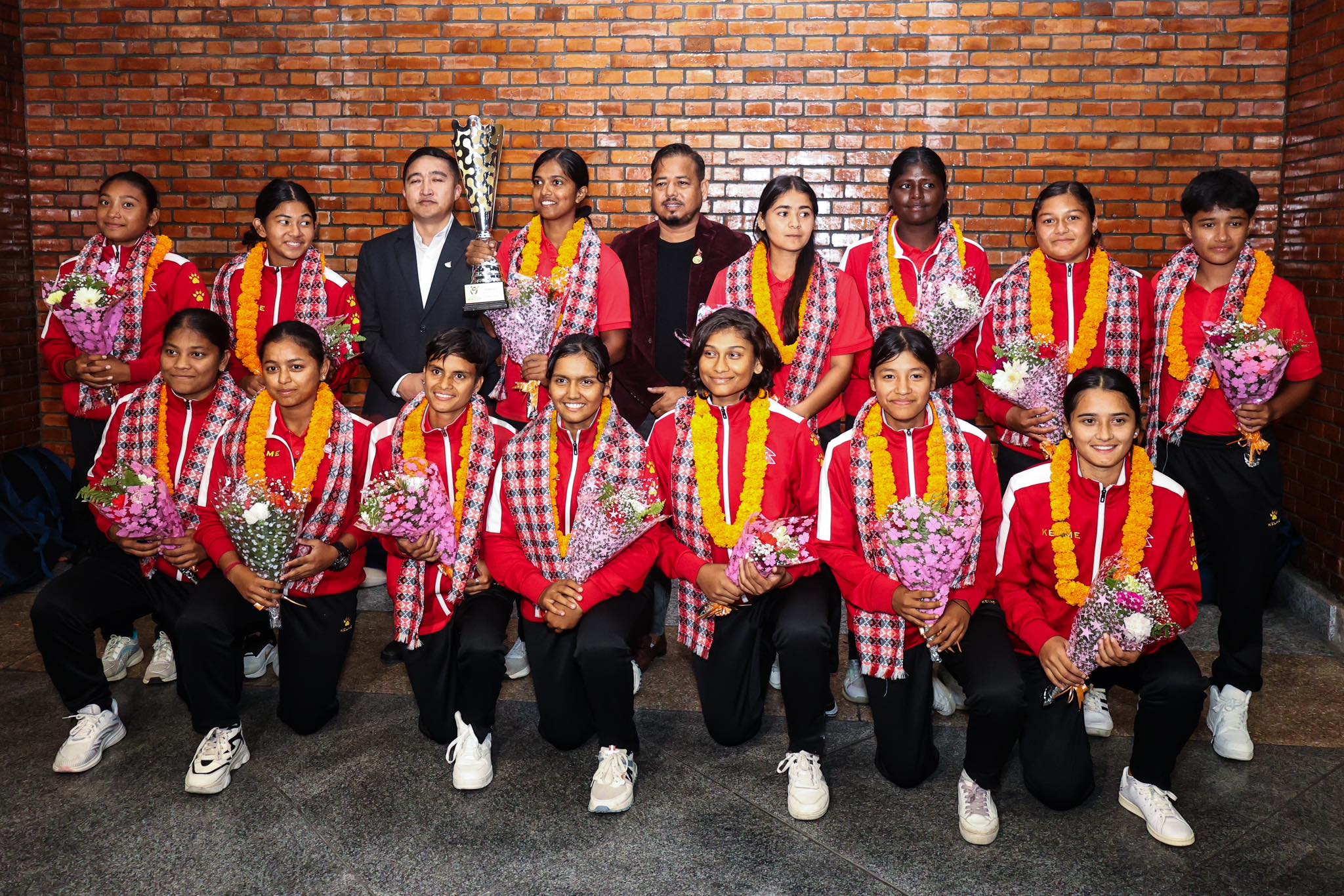 काठमाडौं । विश्वकपमा छानिएको १९ वर्षमुनिको नेपाली महिला क्रिकेट टोली स्वदेश फर्किएको छ । टोलीलाई विश्वकपमा त्रिभुवन अन्तर्राष्ट्रिय विमानस्थलमा नेपाल क्रिकेट संघ क्यानले भव्य स्वागत गरेको छ ।