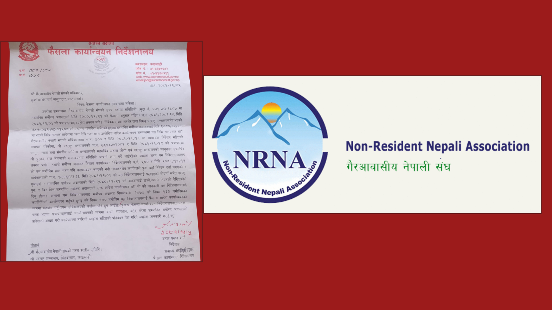 काठमाडौँ । गैरआवासीय नेपाली संघ (एनआरएनए)को सचिवालयलाई सर्वोच्च अदालतको फैसला कार्यान्वयन निर्देशनालयले चेतावनीयुक्त पत्र पठाएको छ । हाल डा.बद्री केसी नेतृत्वको एनआरएनएले सचिवालयबाट काम कारबाही गर्दै आएकोमा निर्देशनालयले शेष घले नेतृत्वको उच्चस्तरीय समितिलाई उक्त कार्यालयको जिम्मा दिन यसअघि पत्राचार गरेपनि कार्यान्वयन नभएपछि मंगलबार दोस्रो चेतावनीयुक्त पत्र पठाएको हो ।