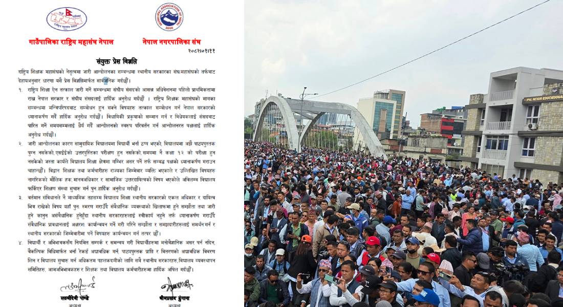 गाउँपालिका राष्ट्रिय महासंघ, नेपालका अध्यक्ष लक्ष्मीदेवी पाण्डे र नेपाल नगरपालिका संघका अध्यक्ष भीमप्रसाद ढुंगानाले संयुक्त विज्ञप्ति जारी गर्दै शिक्षासम्बन्धी मागहरूमध्ये मन्त्रिपरिषद् तहबाट सम्बोधन गर्न सकिने विषयहरू तत्काल समाधान गर्न सरकारको ध्यानाकर्षण गराएका हुन् ।