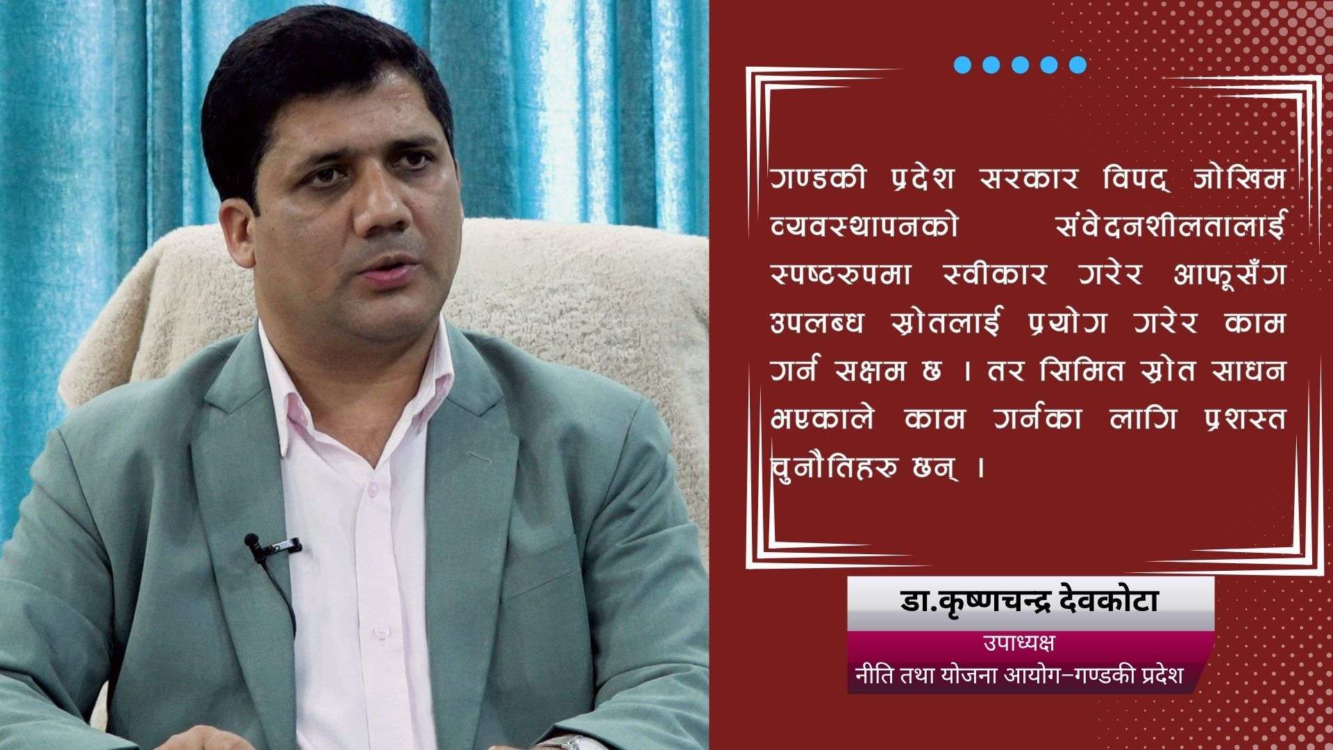 गण्डकी प्रदेशमा जलवायुजन्य धेरै जोखिममा रहेको प्रदेश हो । तर विपद् जलवायु मात्र होइन् । भौगर्भिक जोखिमहरु पनि उत्तिकै छन् । भूकम्पको पनि उच्च जोखिममा रहेको प्रदेश पनि हो । यी सबै कुराहरुलाई हेर्दा गण्डकी प्रदेश दोस्रो पञ्चवर्षे योजनामा विपद्लाई मूख्य तत्वको रुपमा लिएर योजनामा समावेश गरेका छौ । र नीति तथा कार्यक्रममा पनि ती चिजहरुलाई पनि प्राथमिकीरण गरेका छौ । जसले गर्दा प्रदेशमा हुनसक्ने सम्भावित जोखिमहरुको आकंलन गरेर त्यसको लागि हामीसँग भएका स्रोत साधनहरुको अधिकतम प्रयोग गर्नेखाले रणनीति गण्डकी प्रदेश सरकारले तय गरेको छ । तर हामीसँग सिमित साधनहरुको कारणले गर्दा गर्नसक्ने कामहरु पनि गर्न नसक्ने अवस्था छ । त्यसकारण गण्डकी प्रदेश सरकार विपद् जोखिम व्यवस्थापनको संवेदनशीलतालाई स्पष्टरुपमा स्वीकार गरेर आफूसँग उपलव्ध स्रोतलाई प्रयोग गरेर काम गर्न सक्ने अवस्थामा छ । तर सिमित साधन भएकाले काम गर्नका लागि चुनौतिहरु पनि उत्तिकै छ ।
