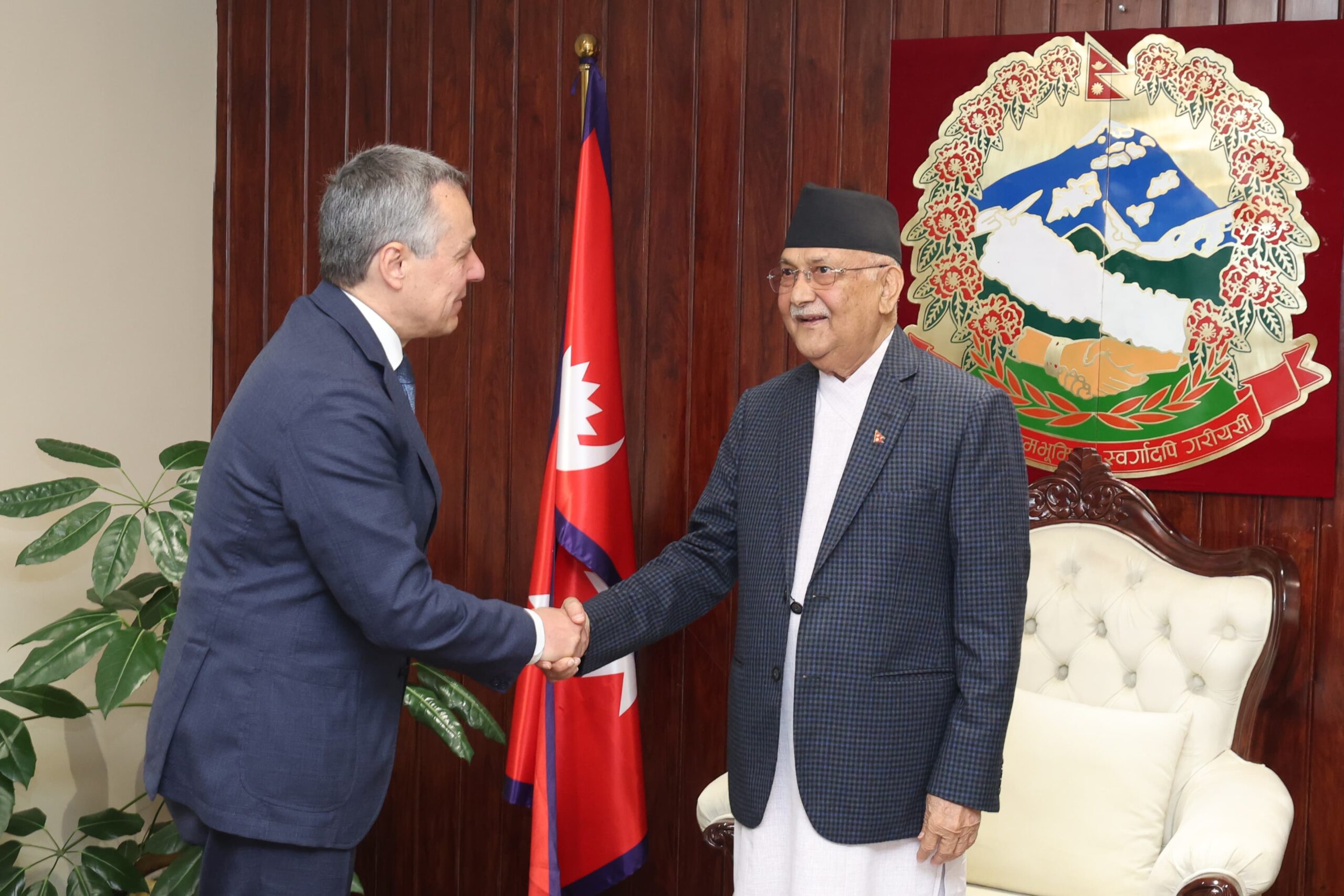 काठमाडौँ । प्रधानमन्त्री केपी शर्मा ओलीसँग स्वीटजरल्याण्डका सङ्घीय विदेशमन्त्री इग्नाजिओ डानियल जिओभान्नी क्यासिसले आज शिष्टाचार भेट गर्नुभएको छ ।