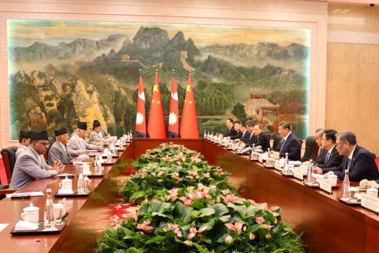 काठमाडौं । प्रधानमन्त्री केपी शर्मा ओली र चिनियाँ राष्ट्रपति सी चिनफिङबीच शाङ्घाई सहयोग संगठन (एससीओ) शिखर सम्मेलनको शिलशिलामा द्विपक्षीय भेटवार्ता भएको छ । आज अपराह्न चीनको तियान्जिन स्थित अतिथि गृहमा भएको भेटमा, राष्ट्रपति सीले प्रधानमन्त्री ओलीलाई स्वागत गरेका थिए ।