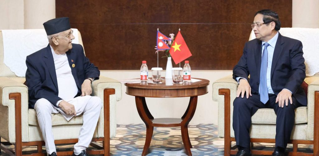 काठमाडौं । प्रधानमन्त्री केपी शर्मा ओली र भियतनामका प्रधानमन्त्री फाम मिन चिङबीच चीनको थियानजिनमा द्विपक्षीय भेटवार्ता सम्पन्न भएको छ ।