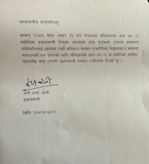 प्रधानमन्त्रीको राजीनामा राष्ट्रपति समक्ष बुझाइएको शीतल निवासले पुष्टि गरेको छ। राजीनामा पत्रमा प्रधानमन्त्री ओलीले लेखेका छन्: “मुलुकमा उत्पन्न असामान्य परिस्थितिलाई ध्यानमा राख्दै, संविधान सम्मत राजनीतिक निकासका लागि र समस्या समाधानको थप पहलको आवश्यकता महसुस गरी संविधानको धारा ७७ (१)(क) बमोजिम आजैका मितिदेखि लागू हुने गरी प्रधानमन्त्री पदबाट राजीनामा दिएको छु।”
