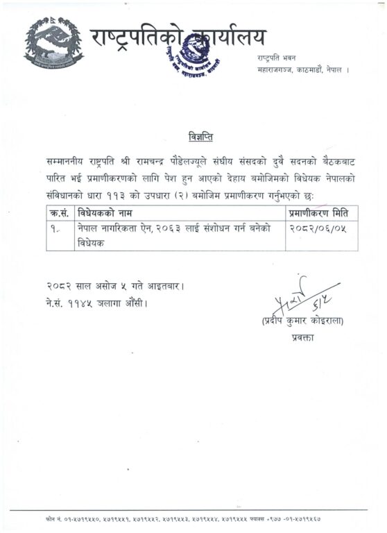 काठमाडौं । राष्ट्रपति रामचन्द्र पौडेलले नेपाल नागरिकता ऐन २०६३ संशोधन गर्न बनेको विधेयक प्रमाणीकरण गरेका छन्।
