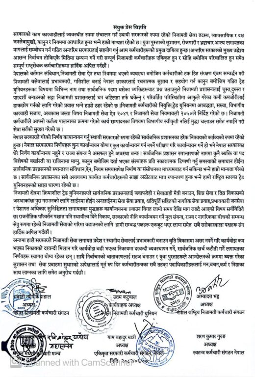 “संविधान र कानुनले दिएको अधिकारमा टेकेर काम गरिरहेका कर्मचारीहरूलाई टार्गेट गरेर राजीनामा माग्ने, कानुनी प्रक्रियाअनुसार गठन भएका निकायहरूलाई जबरजस्ती विघटनको प्रयास गर्ने कार्यहरू लोकतान्त्रिक प्रशासनको संकेत होइन,” एक युनियन नेताले भने।