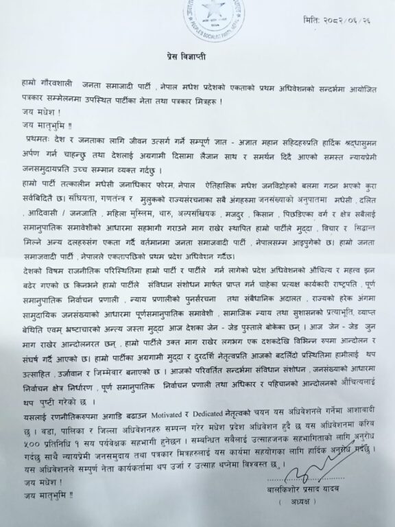 जनकपुर । जनता समाजवादी पार्टी (जसपा) नेपालको मधेश प्रदेश अधिवेशन भोलीबाट सुरु हुने भएको छ । जसपा नेपालले आज जनकपुरधाममा पत्रकार सम्मेलनमार्फत असोज २७ र २८ गते जनकपुरधाममै प्रदेश अधिवेशन हुने जानकारी दिएको छ ।