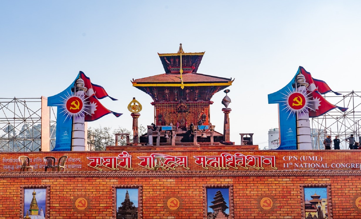भक्तपुर । नेकपा (एमाले)ले ११औँ महाधिवेशनको उद्घाटनका लागि भक्तपुर सल्लाघारीमा १०८ रोपनीमा फैलिएको भव्य मञ्च तयार पारेको छ। काठमाडौं उपत्यकाको कला, संस्कृति र वास्तुकलालाई समेटेर बनाइएको मञ्चको मूल डिजाइन चाँगुनारायण मन्दिरबाट प्रेरित छ। मञ्चमा शंख, चक्र, घन्टा, धरहराको प्रतिरूपसहित उपत्यकाका पुरातन सम्पदाका आकृतिहरू सजिएका छन्।