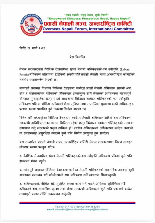 काठमाडौँ । प्रवासी नेपाली मञ्च, अन्तर्राष्ट्रिय कमिटीले वैदेशिक रोजगारीमा रहेका नेपाली श्रमिकहरूको श्रम स्वीकृति नविकरण प्रक्रियामा अवरोधप्रति गम्भीर ध्यानाकर्षण भएको जनाएको छ।