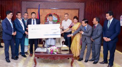 काठमाडौँ। प्रधानमन्त्री केपी शर्मा ओलीसमक्ष नेपाल बैँक लिमिटेडबाट प्रधानमन्त्री दैवी प्रकोप उद्धार कोषका लागि रु