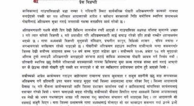 बिरगञ्ज: कालिकामाई गाउपालिका वडा नम्बर २ का अध्यक्ष सोनालाल चौरसियाले गाउँपालिका अध्यक्ष बशिष्ठ कुमार लगायत