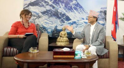 काठमाडौं । राष्ट्रिय सभाका अध्यक्ष गणेशप्रसाद तिमिल्सिनासँग नेपालका लागि अष्ट्रेलियन राजदूत फेलिसिटी भोल्कले शिष्टाचार भेट