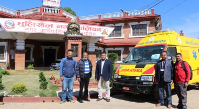 धुलिखेल १० बैशाख : काभ्रेको धुलिखेल नगरपालिकालाई भारत सरकारले अत्याधुनिक सुविधा सहितको एम्बुलेन्स सहयोग गरेको
