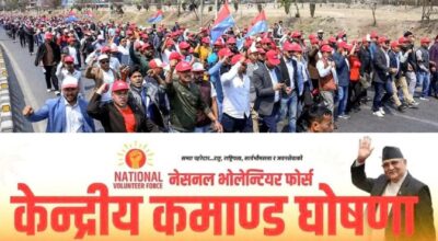 काठमाडौं । नेकपा एमाले आज पार्टीभित्र नीति, सिद्धान्त र नेतृत्वको सुरक्षालाई सुदृढ बनाउन नेसनल भोलेन्टियर फोर्स (एनभीएफ) औपचारिक रूपमा घोषणा गर्न तयारी अवस्थामा छ। माइतीघर मण्डलामा भेला भएर बानेश्वरसम्म मार्चपास गरिनेछ र त्यसपछि बबरमहलस्थित कार्की बैंक्वेटमा विशेष कार्यक्रममा फोर्सको उद्घाटन गरिनेछ। जनसंगठन संयन्त्र प्रमुख भानुभक्त ढकालका अनुसार समाजमा बढ्दो असुरक्षा, राजनीतिक अशान्ति तथा भदौ २३–२४…